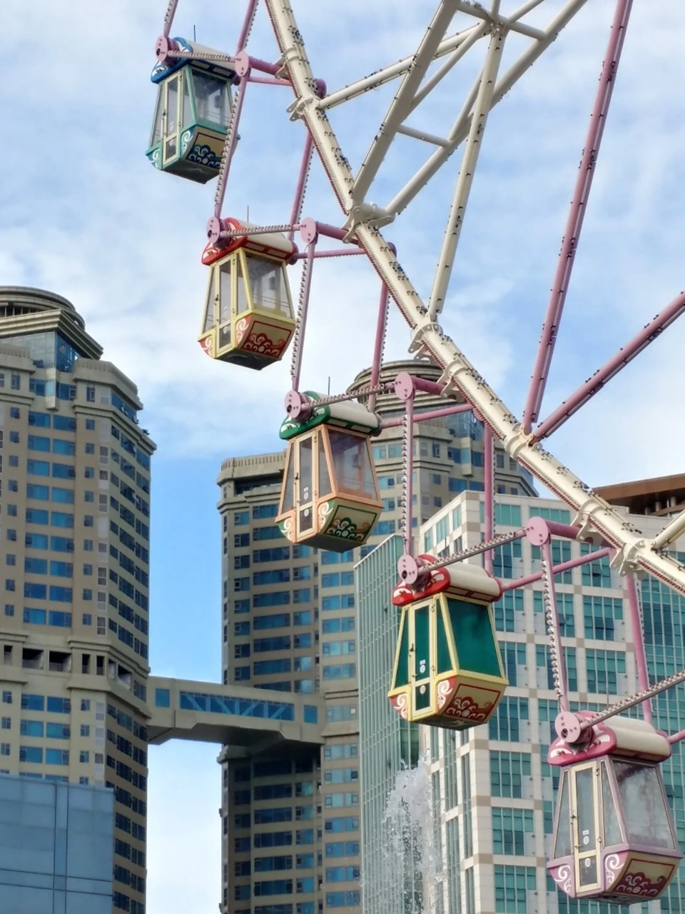 전날 밤 숙소에서 빤히 보였던 대관람차를 타러 갔다. 템즈강변의런던 아이처럼 도시 전체를 조망할 수 있게 느릿느릿 회전하는 대관람차는1893년 시카고 엑스포를 선두로 세계 유명 도시의 상징적인 놀이기구가 되었다. 지금은 놀이공원이나 유원지에서도 흔하게 볼 수 있지만 울산이라는 도심에서 만나게 될 줄이야. 우리 나라 대표 공업도시에 설치된 의외의 낭만인데다 탁트인 사방이 궁금해 기대감으로탑승했다. 규모가 크지 않다고 생각했는데 막상 정점에 도달하니 도시는 미니어처가 되었다. 백화점 건물 7층이탑승장소라 더 높게 체감되었던 것 같다.