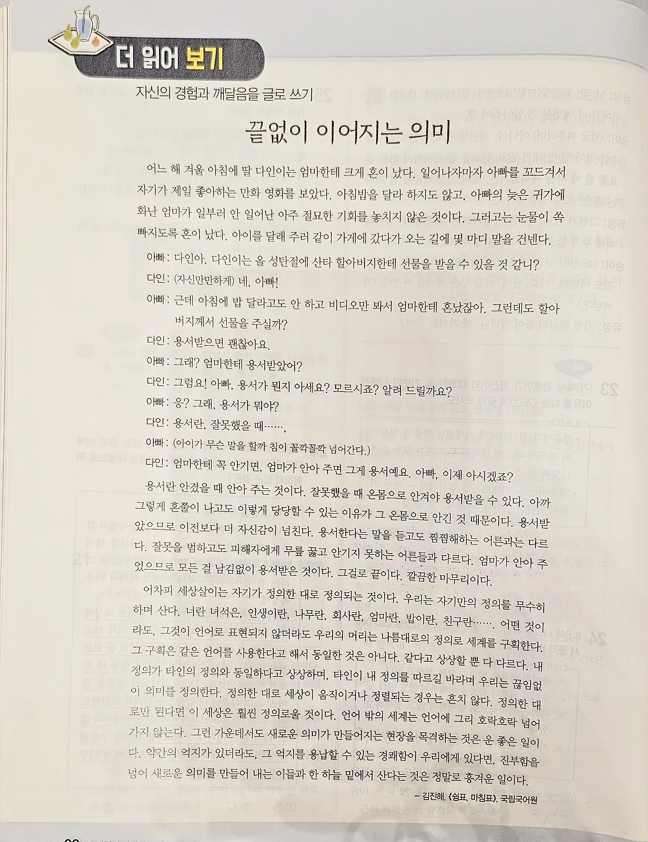 요즘의 국어 교과서는 몹시도 훌륭하여, 곱씹을수록 깨달아지는 바가 넘치는데 아이들에게는 그저 시험 범위로만 다가올 테지. 그 시절의 나도 그랬던 것처럼.