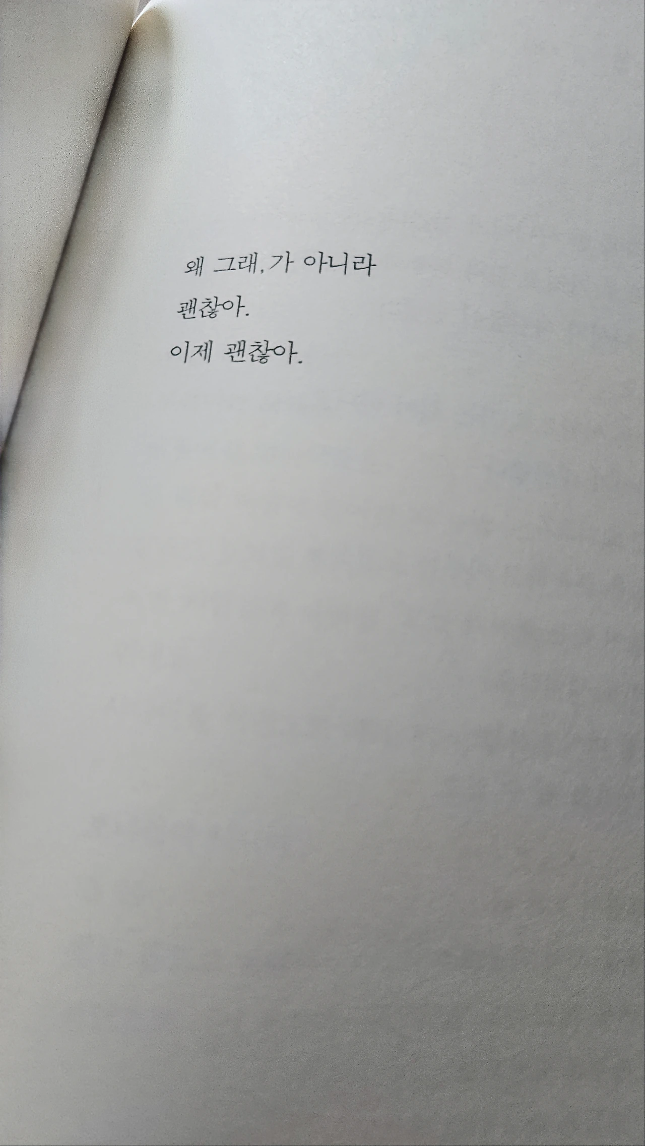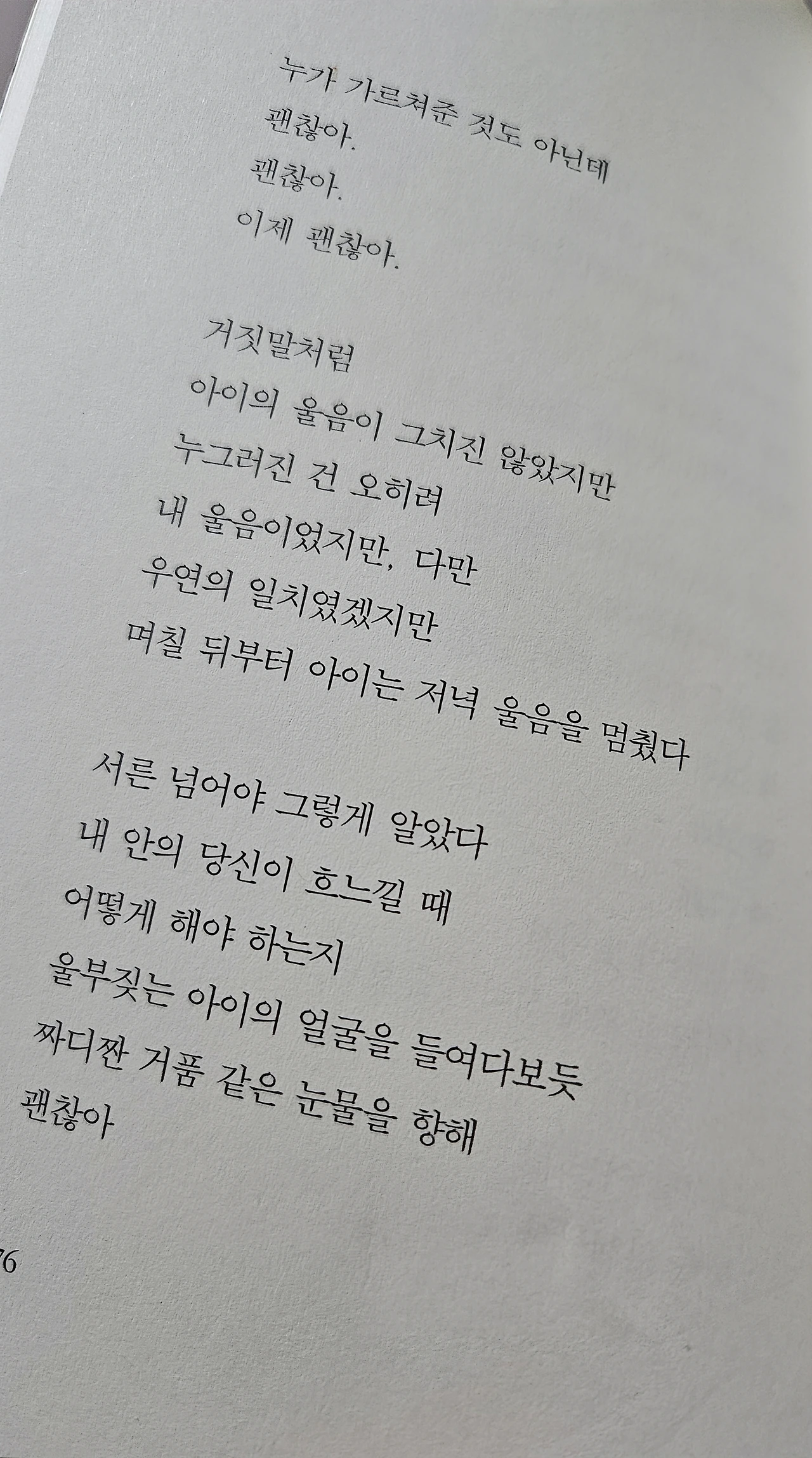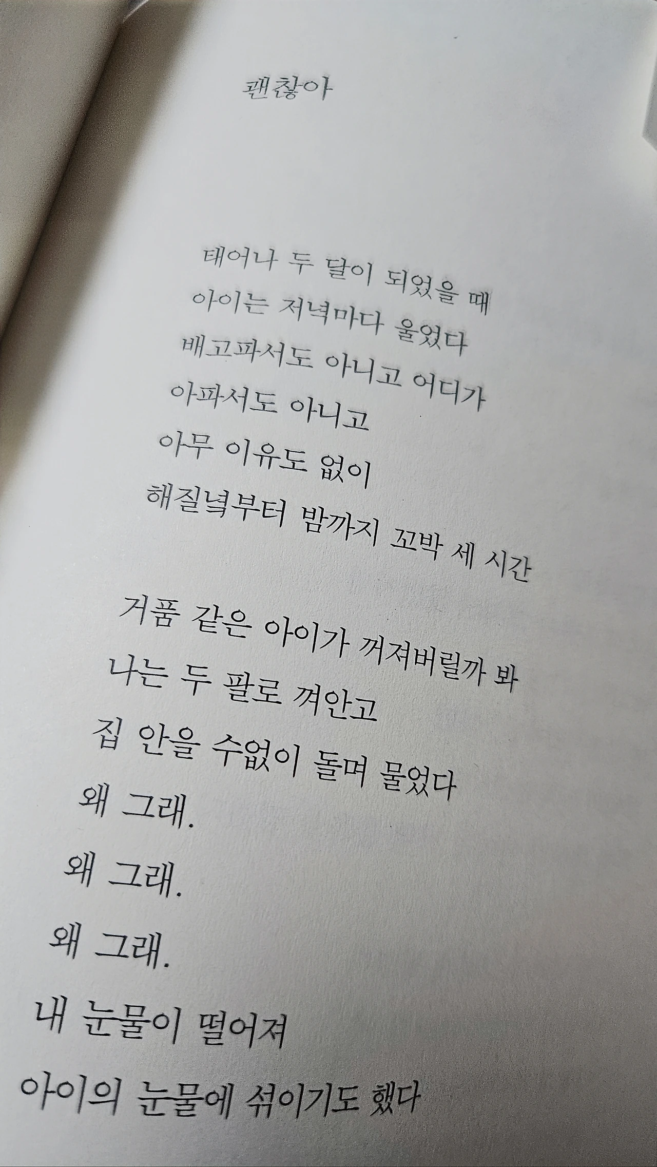 한참을 눈물, 콧물을 뺀 후에 이번엔 나민애 교수님께서 <두 번째 교과서>에서 소개해 주신 한강의 <괜찮아>라는 시가 떠오른다. 시집을 펼쳐 읽다가 나 혼자 오열한다. 흠, 갱년기가 분명하다.