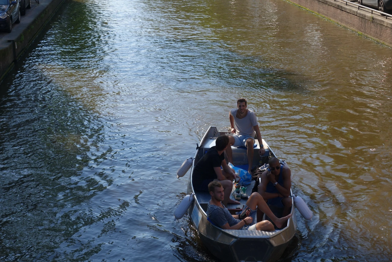 운하를 따라 걸으며 우리는 이런 비슷한 장면을 수도 없이 보았다. 크기도 다양한 배를 탄 젊은 남녀가 한가롭게 앉아 마시고 먹고 노는 장면. 서울에서 친구들이 만나면 "야, 우리 오랜만에 모였는데 한 잔 하러 가자!"라고 하는 것처럼 암스테르담에서는 "헤이, 우리 오랜만에 모였는데 배나 타러 가자!"라고 하는 걸까. 그런데 유독 남자 비율이 높아 보이는 건 나만의 착각이었을까?