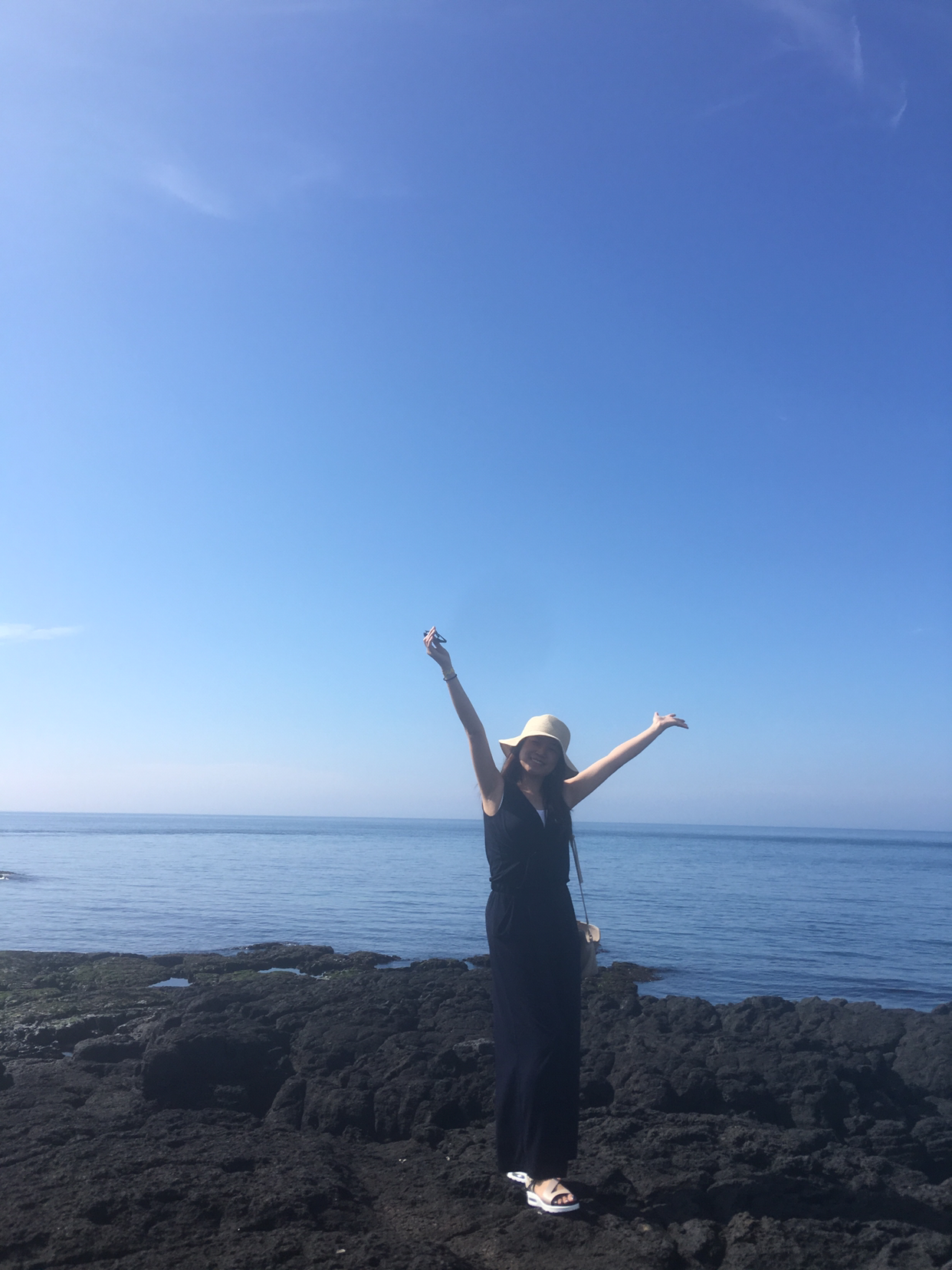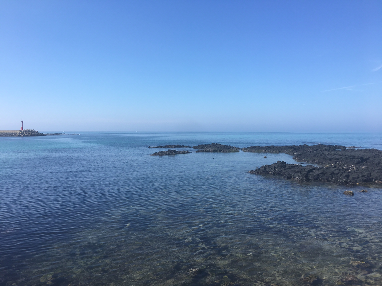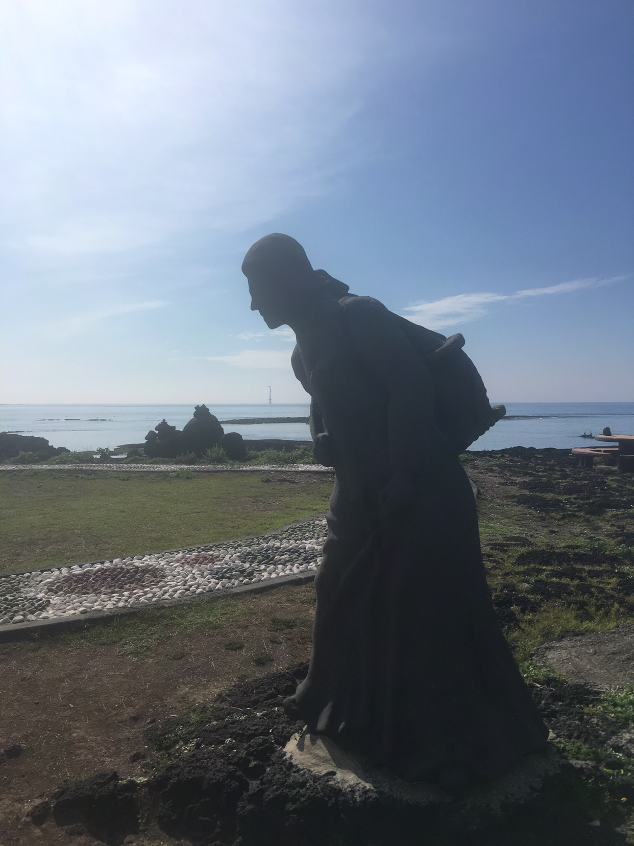 월정리에서 십 분 정도만 달리면 나오는 한적한 바다였다. 보아하니 관광객은 얼씬도 하지 않고 않는 도민들만 한가로이 산책 나오는 곳이었다. 고요한 분위기도 좋았지만 무엇보다 청명한 푸른 바다를 배경으로 서 있는 할망(망태기를 짊어진)의 동상이 인상적이었다.