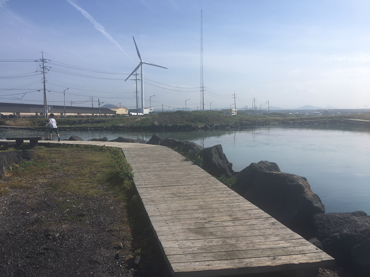 오른쪽에 보이는 저수지는 바다와 연결돼 있는데, 여기로 양식하다 실패한(?) 물고기들을 방류한다고 한다. 보통 크기가 작거나 하여 상품성이 떨어지는 물고기라는데, 자세히 보니 바닥에 광어로 추정되는 물고기가 납작 엎드려 있었다. 이 물고기는 아무나 건져가서 먹어도 된다고 한다. 제주도 사면 굶어 죽을 일은 없다더니 참말이었다.