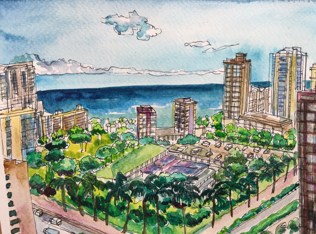 35층에 있는 숙소 창 밖에는 이런 풍경이 펼쳐졌다. 멀리 보이는 쪽빛 바다가 바로 와이키키.