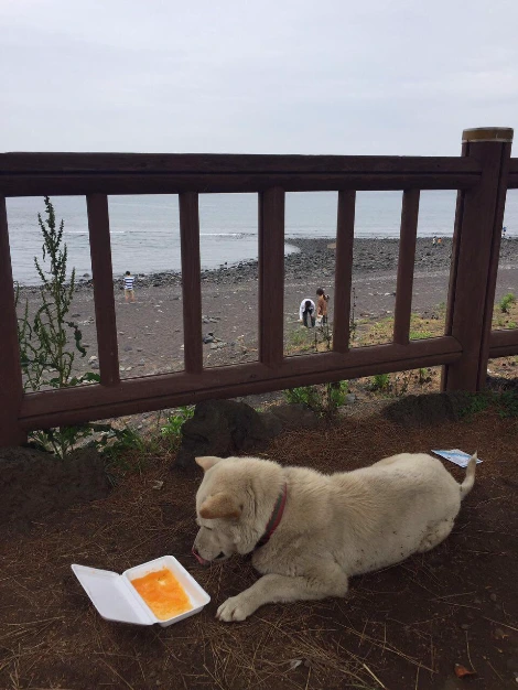 멍멍이가 멀리서 우리의 천혜향 주스를 발견하고 다가왔다. 그런데, 마침 공장에서 생산된 천혜향 주스는 올레 시장에서 먹었던 것과 달리 끔찍이 맛이 없었다. 나는 혜자 미소를 지으며 일회용 도시락통에 주스를 넉넉히 부어 주었다.