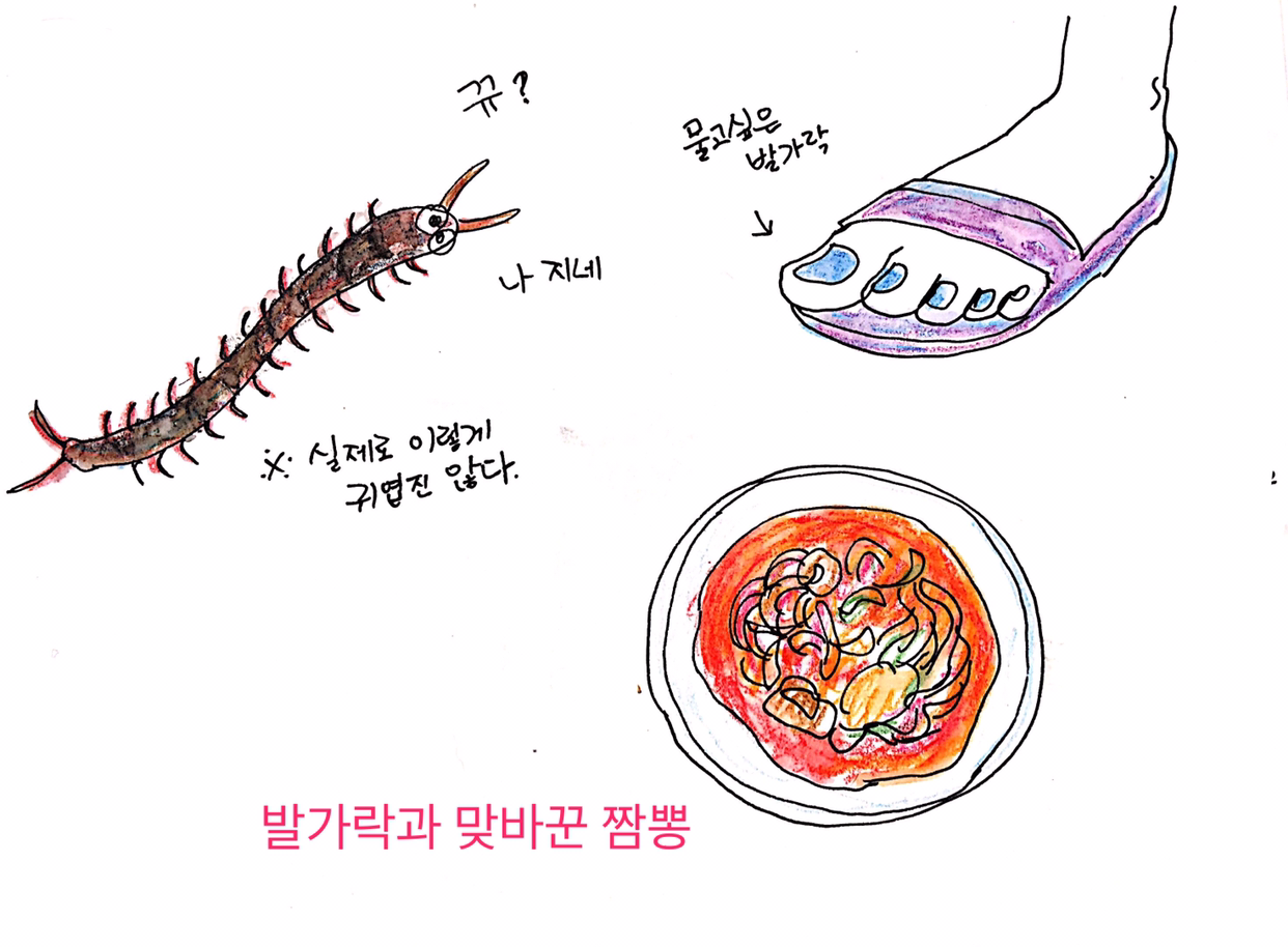 바닥을 보니, 새끼손톱만 한 새까만 지네가 지나가는 게 아닌가! 저게 지금 내 발가락을 문 거야? 나는 얼른 신발을 벗고 발을 의자 위로 올렸다. 우리의 소동에 지네도 겁을 먹었는지 어디론가 숨어 버렸다. 지네한테 물린 엄지발가락은 벌에 쏘인 듯 따끔했고 그 부위가 점점 붓는 느낌이었다.
