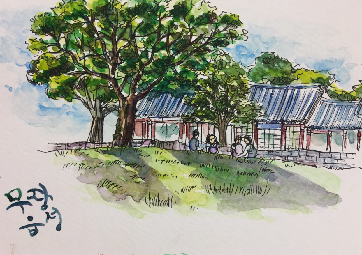 보시다시피 초등학생이 그린 것 같은 그림이 되었다. 그런데 어디선가 진짜 초등학생 무리가 갑자기 나타났다. 아이들은 나를 에워싸더니 내 그림에 흥미를 보이기 시작했다. 한 여자 아이가 내 고체 물감 팔레트를 보며 물었다.