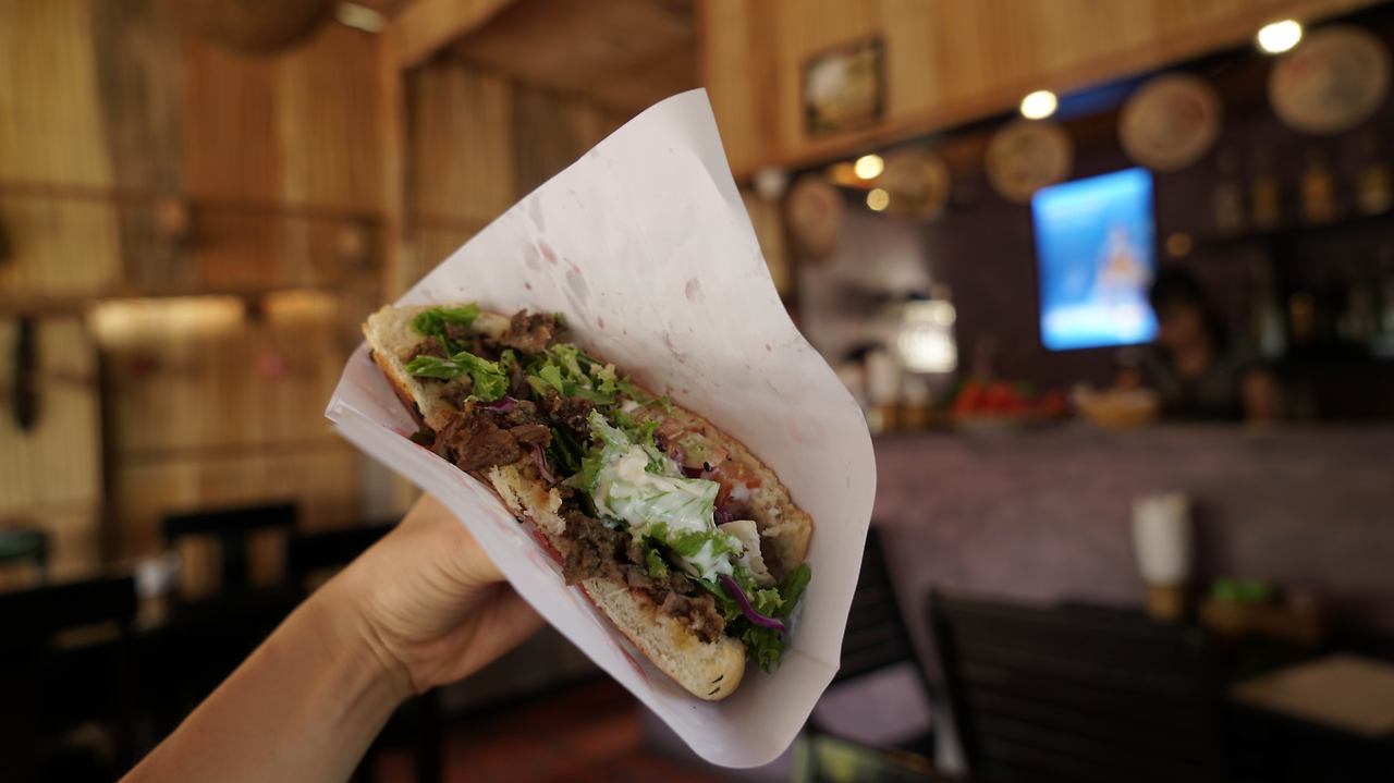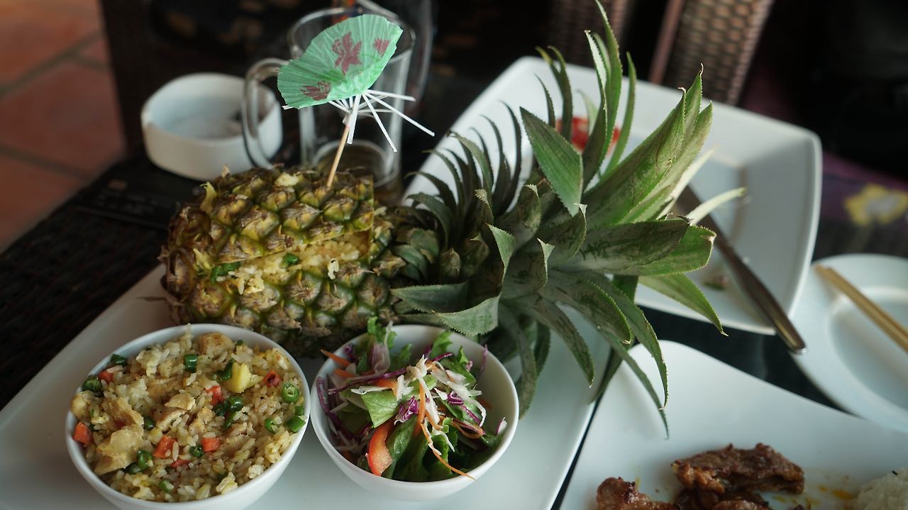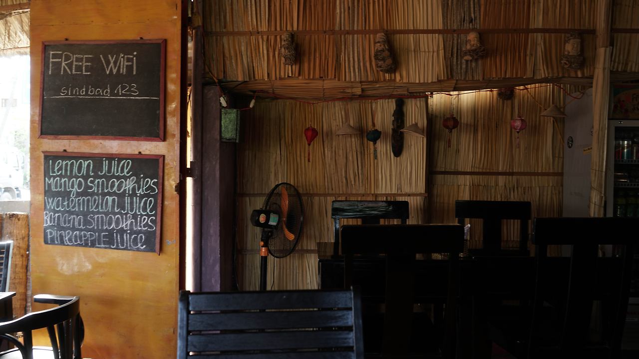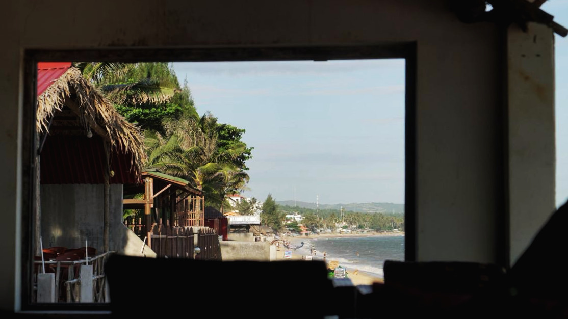 베트남 카이트 서핑 샵과 함께 있는 식당 바다를 바라볼 수 있는 창문이 좋고, 햄버거와 파인애플 밥이 맛있다.