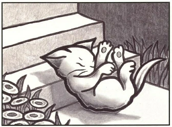 슬피고 지치고 배가 고픈 고양이는 이제 모든 것을 포기하고 타박타박 집으로 돌아올 수 밖에 없었어요.