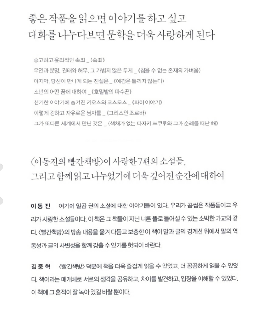 등 7편의 소설에 대해 이동진, 김중혁 작가는 각 작품들과 소설가들에 대한 다양한 이야기들을 솔직하게 표현한다.