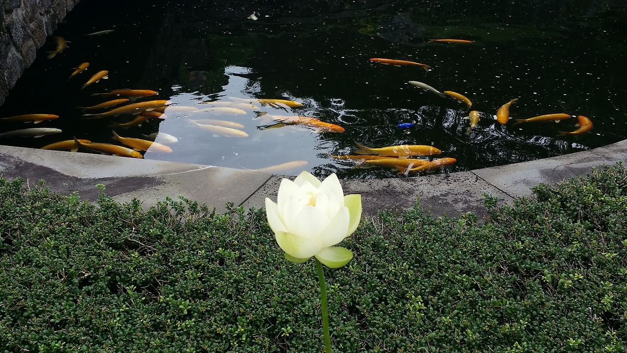 잘 가꾸어진 정원에서 나무, 돌 그리고 꽃을 만나다.