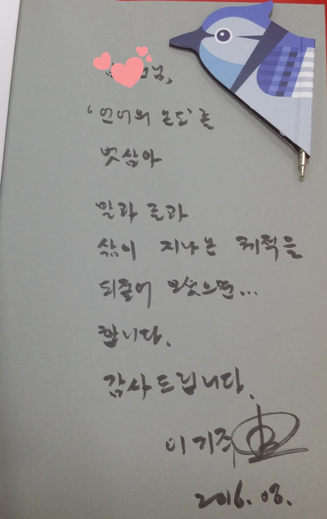 이기주 작가님이 손수 써주신 글귀가 담긴 책 2권과 귀여운 새모양의 마그네틱 북마크 겸 볼펜, 나비 모양 책갈피,