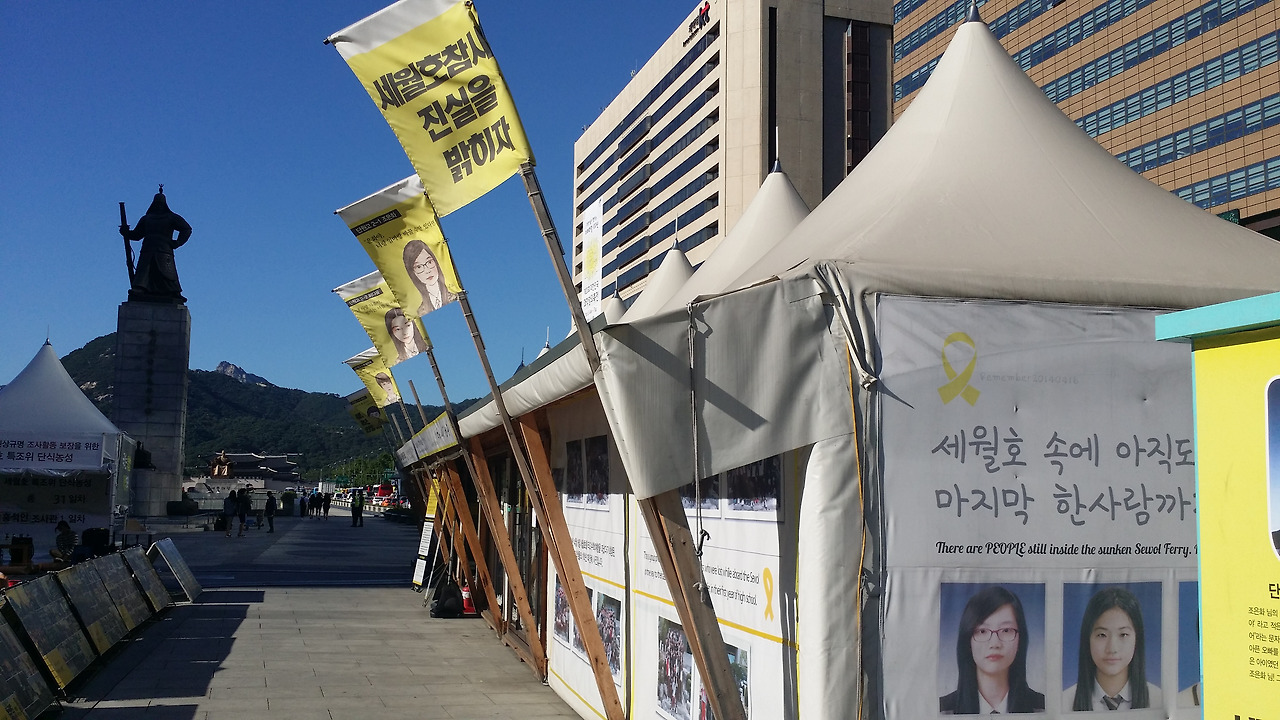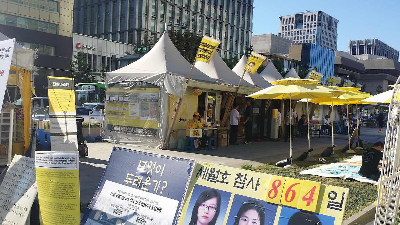 진상 규명과 선체 인양 촉구를 위한 서명대, 노란 리본 공작소, 1인 피켓팅하는 분, 아직도 차디찬 물 속에 있는 9명의 사진, 그 중심에 묵묵히 진상 규명을 위한 싸움을 힘겹게 이어나가는 분들이 있다. 죄스러워서 차마 그분들의 모습은 찍을 수가 없었다.