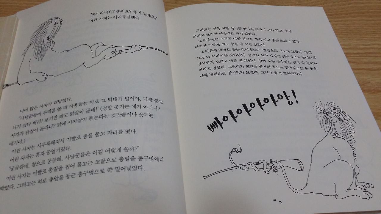 어린 사자가 총으로 '파리의 귀에 붙은 먼지까지' 날려보냈다는 부분에서,