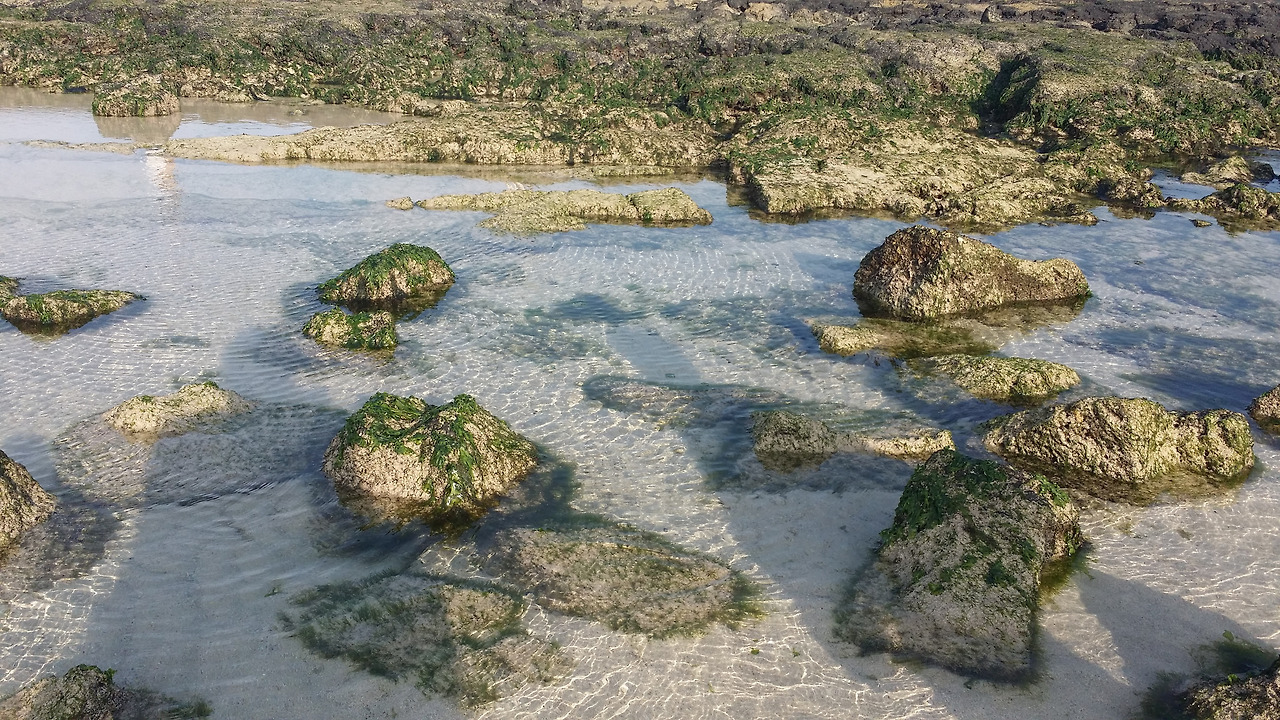 투명한 물빛에 모래색깔 보호색의 물고기, 게, 그리고 모래위를 뽈뽈 기어다니는 소라게.