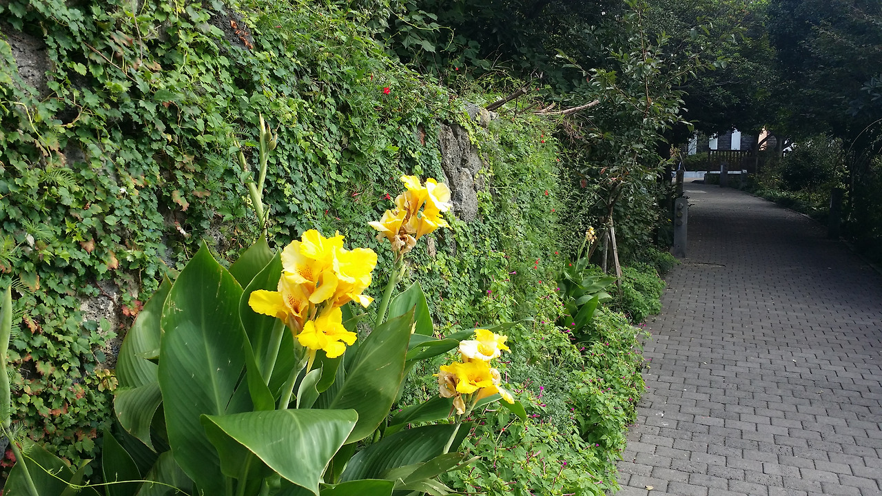 미술관 들어가는 입구. 돌담의 노란 꽃이 화사한 인사를 건넨다.