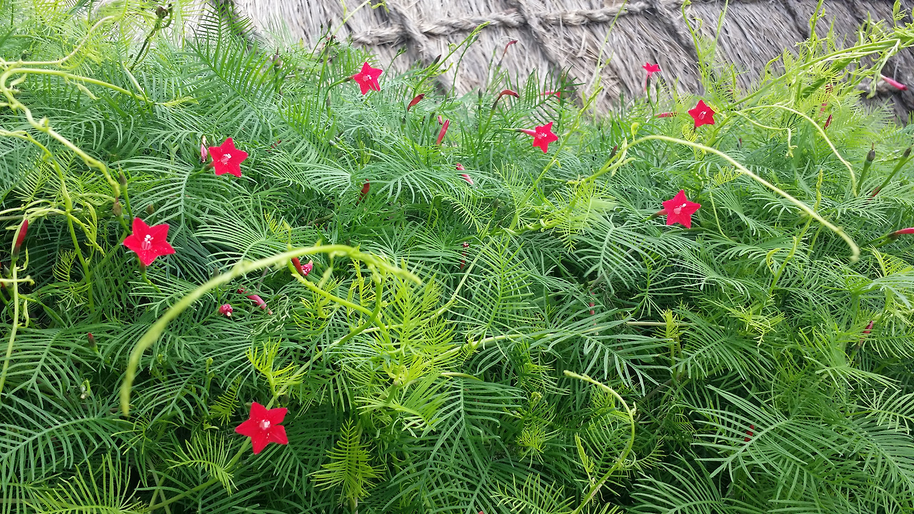 초가집 지붕 위 붉은 꽃은 아름다움을 더하고,