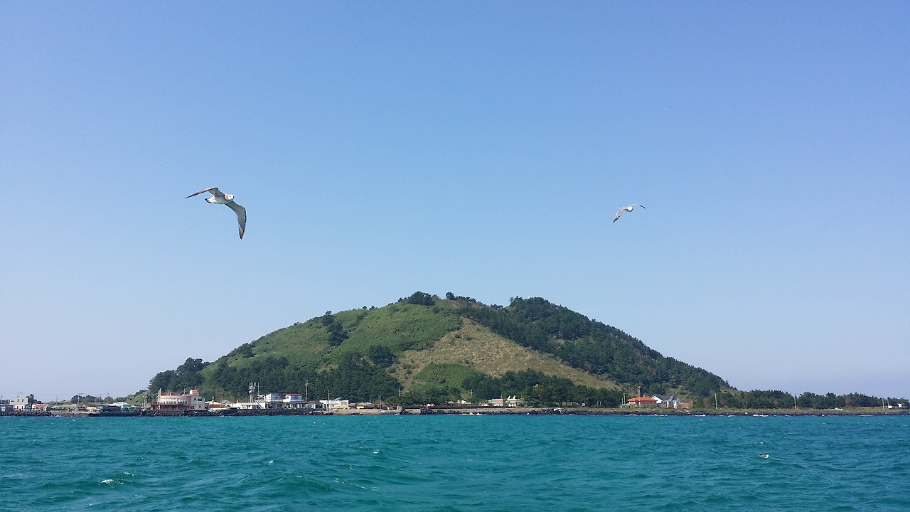 약 15분여 후, 짙은 초록빛 바다 위의 작은 섬 비양도가 지척에 보인다.