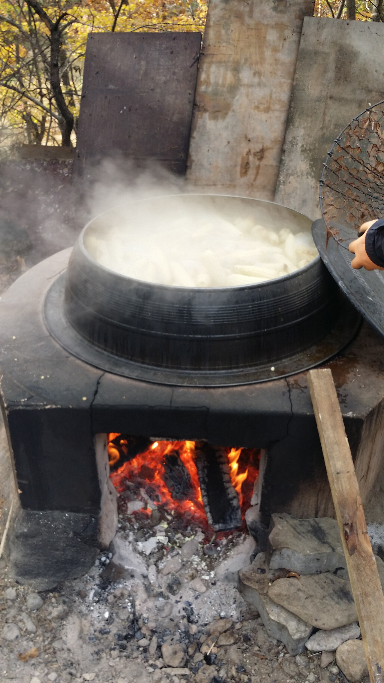 김이 모락모락 가마솥 안, 찰진 옥수수들.