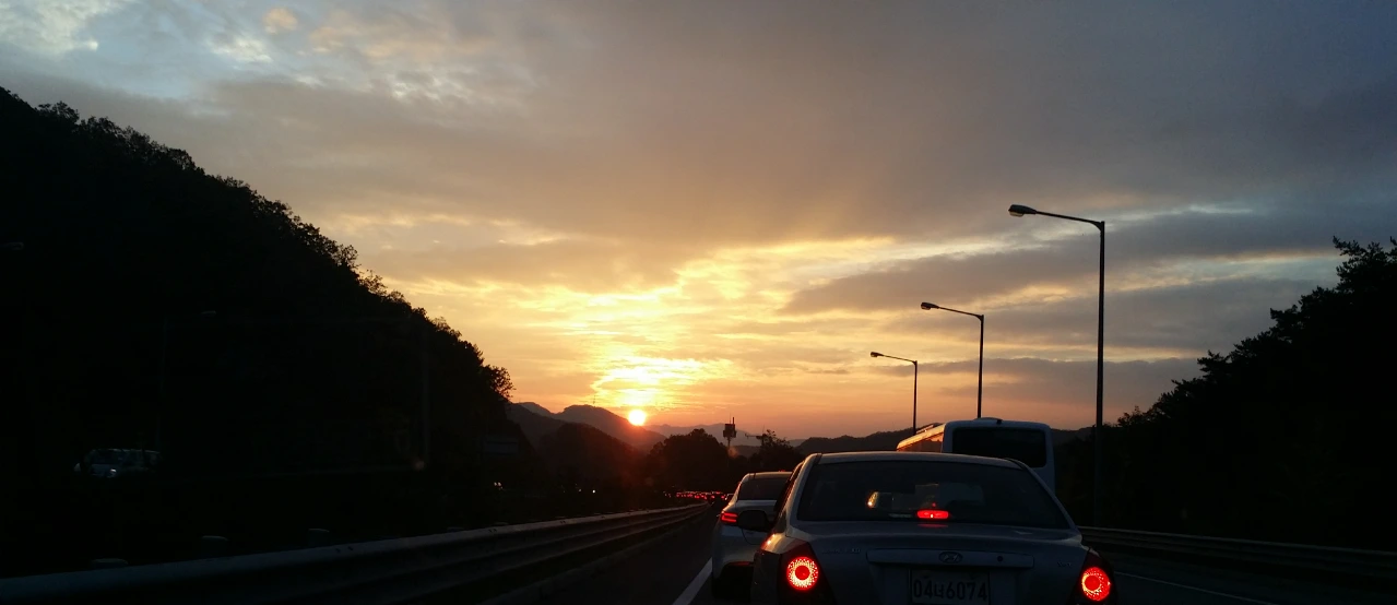 석양을 바라보며 서울로 향하는 차들의 행렬.