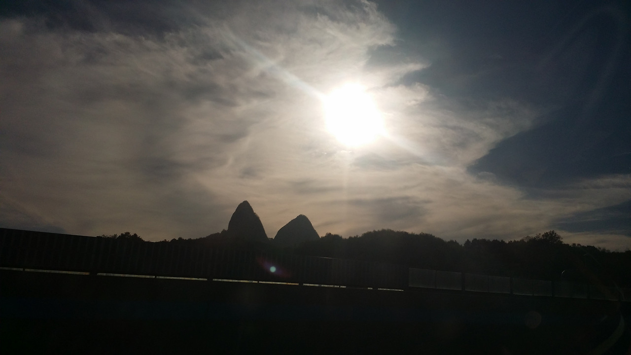 가고 오는 길에 저멀리 보이는 마이산의 두 암봉, 동봉(수마이산)과 서봉(암마이산). 두 봉우리의 모양이 말의 귀처럼 생겼다 하여 마이산이라는 이름이 붙었다고 한다.