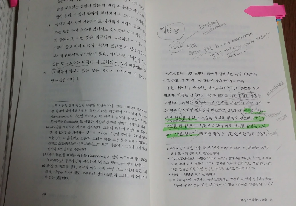 라지만, 내가 읽어본 바로는 비극의 본질, 비극의 6가지 요소(특히 플롯), 시와 역사의 차이점, 급전과 발견, 작가의 임무 등 에 대한 아리스토텔레스의 견해를 들을 수 있는 시간이었다.