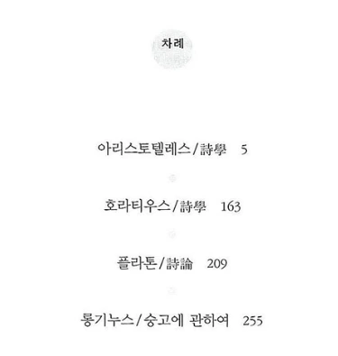 마지막 롱기누스의 '숭고에 관하여'는 아직 읽지 못했지만, 호라티우스의 '시학'과 플라톤의 '시론'은 아리스토텔레스의 '시학'보다 읽기가 훨씬 수월하다.