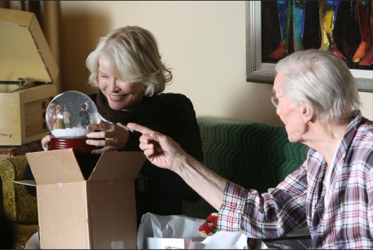 할머니는 할아버지한테 좋아하는 그림을 계속 그렸으면 좋겠다는 의미로 물감을 선물하고 할아버지는 할머니가 좋아하는 스노우볼을 포함한 여러 개의 상자를 할머니한테 준다.