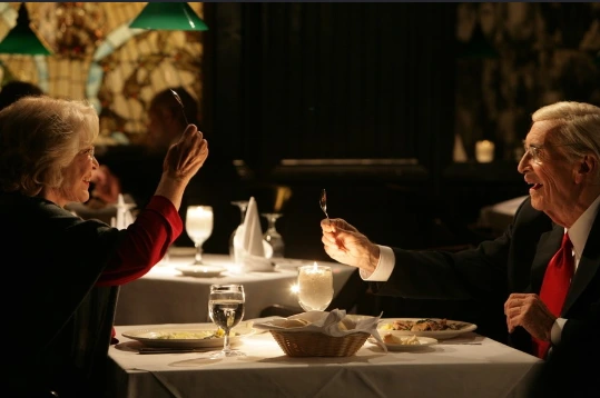 레스토랑의 한 테이블에 마주 앉아 식사를 하며 화기애애하게 담소를 나누는 두 사람.