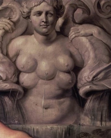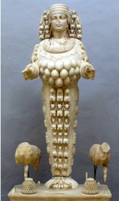 가슴에 주렁주렁 달린 유방은 아르테미스가 생명의 모태로서의 '위대한 어머니'라는 것을 생생하게 보여준다.