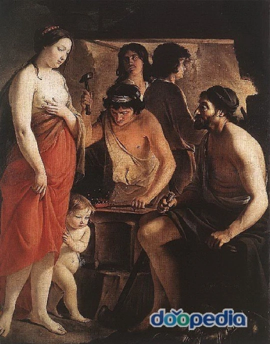 ( 제우스의 방패 아이기스와 번개, 아폴론과 아르테미스의 활, 아테나와 아레스의 창, 데메테르의 낫과 디오니소스의 술잔, 아킬레우스의 갑옷과 투구, 방패 등)도 그의 손에서 탄생한다.