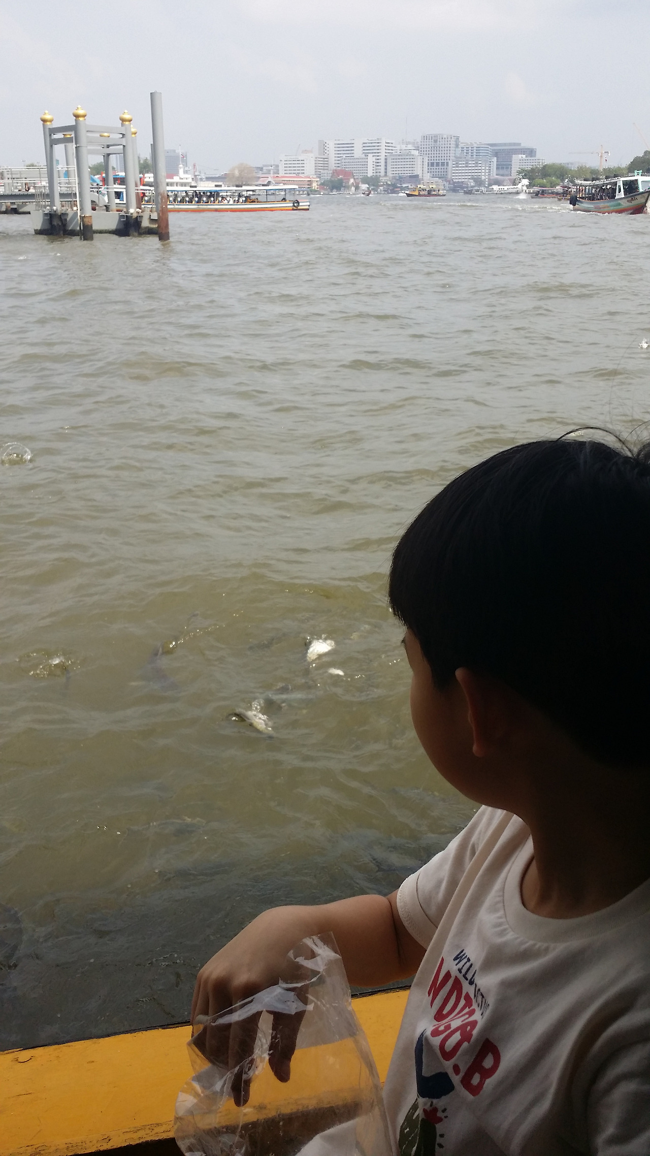 차오프라야강 선착장에서 조금은 시원한 강바람을 맞으며 배를 타고 달리니 아이도 그제서야 화색이 돌아온다.