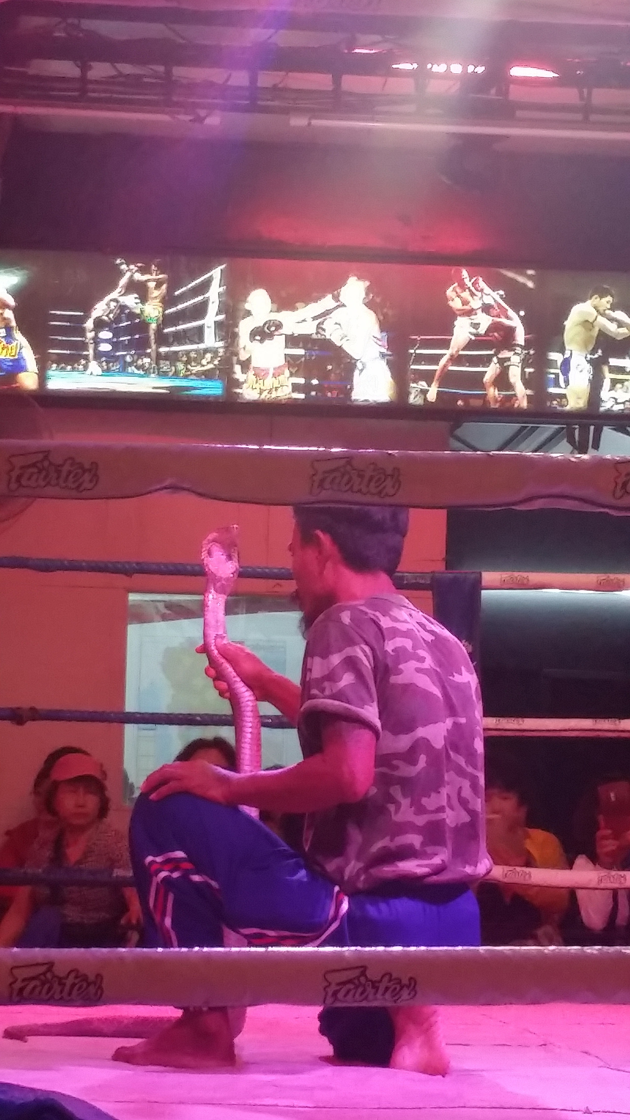 다음으로 향한 곳은 나이트라이프를 즐길 수 있다는 파타야의 워킹스트리트. 화려한 불빛의 레스토랑, 노천 카페, 클럽 등 흥겨운 분위기..를 몸소 체험해보지는 못하고 맥주 한 병에 뱀쇼, 무에타이 쇼만 잠깐 보고 태국 택시 썽테우를 타고 호텔로 복귀했다. (여기서도 비용을 지불하면 커다란 뱀을 목에 두르고 사진을 찍는 체험을 할 수 있다)