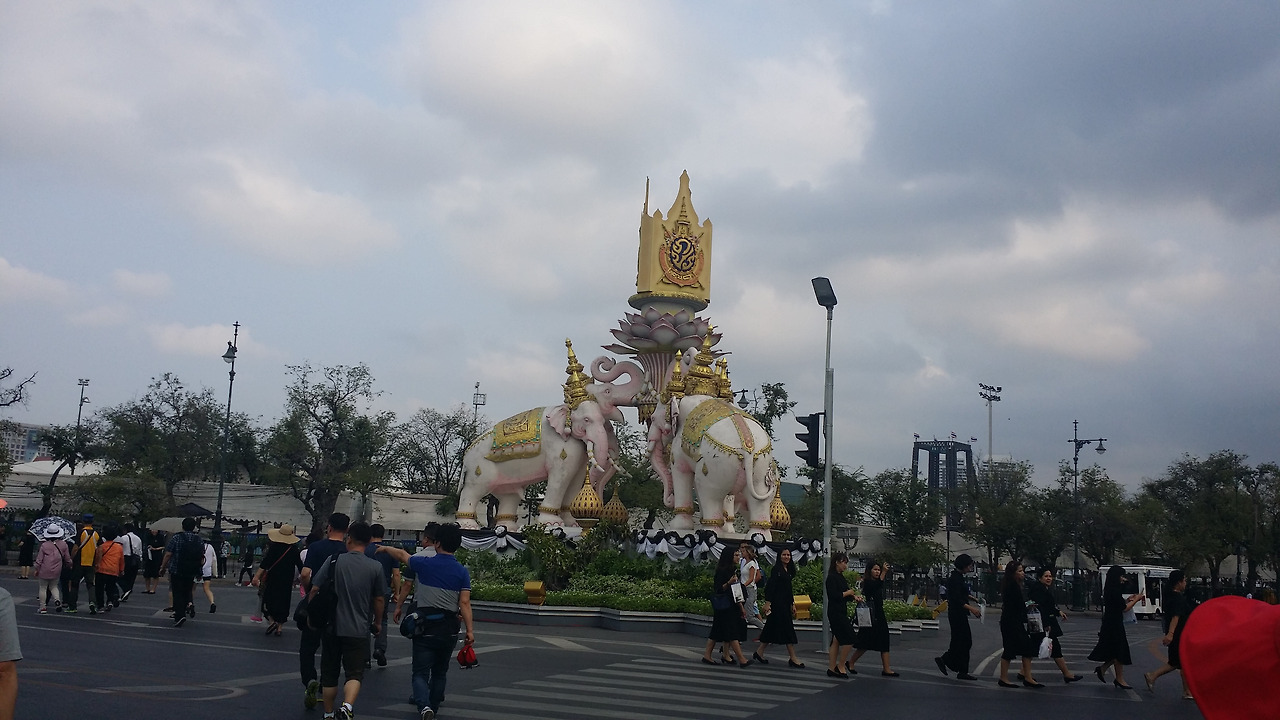 왕궁 입구를 향해 걸어가는 길에 보이는 커다란 코끼리 조각상과 그 앞에 검은 옷을 입은 추모 행렬.