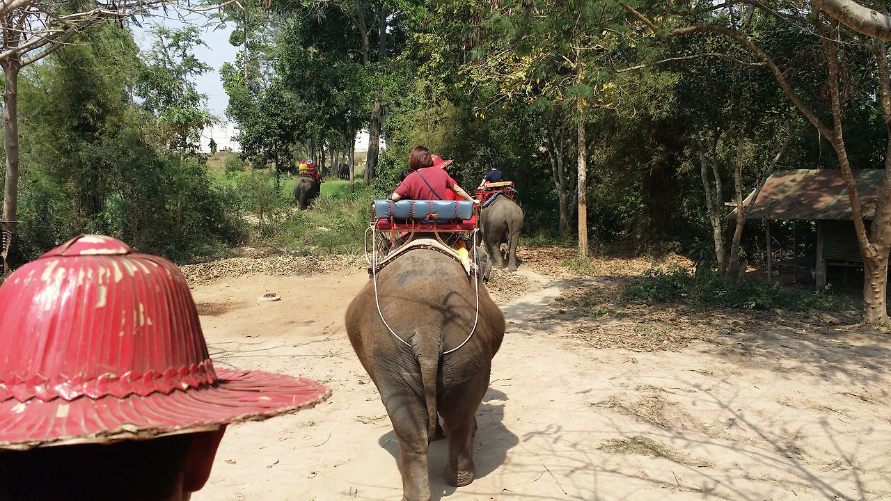 메마르고 울퉁불퉁 황량한 땅 위에 뜨거운 햇볕이 작열하고..코끼리 위에서 제일 앞에 탄 태국인 조련사가 낫 비스무리한 것을 들고(코끼리의 커다란 귀 뒤를 간질이면서 방향 조절하는 용도) 뒤에 탄 관광객들에게 코끼리 머리카락을 들이미며 살 거냐고 물어본다. 머리카락이라고 해봤자 몇 가닥 없어보이는 코끼리의 머리 잔등이 어쩐지 짠해져 괜히 탔나 싶은 순간이었다.