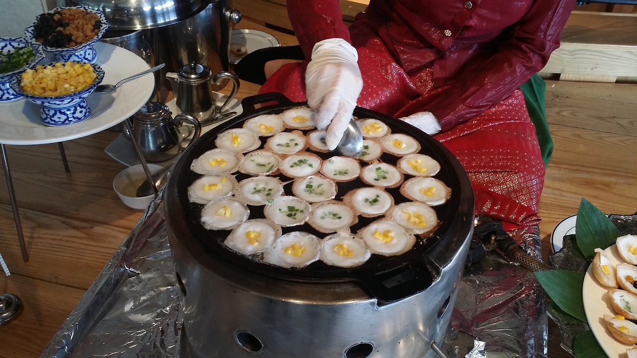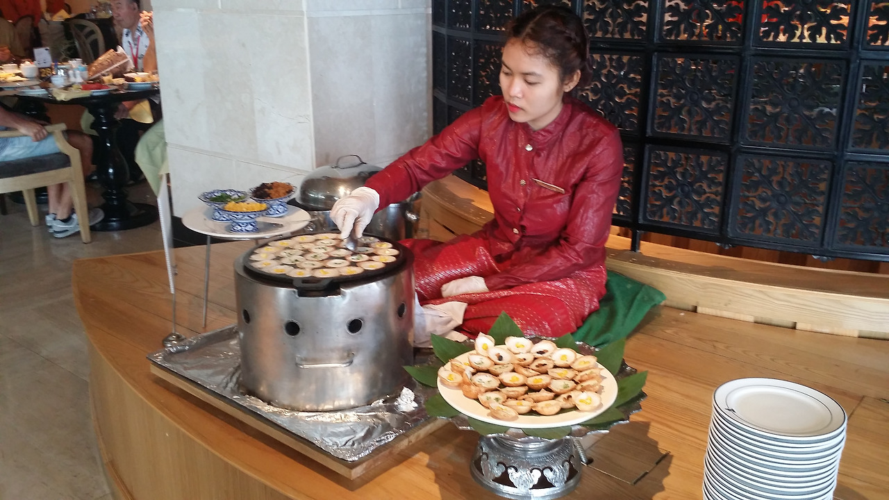 다양한 뷔페식 음식 중에서도 맘에 들었던 태국식 풀빵 '카놈 크록'(코코넛 밀크가 들어간 간식). 한쪽 코너에서 직접 굽고 있는 여종업원의 모습이 인상적이다.