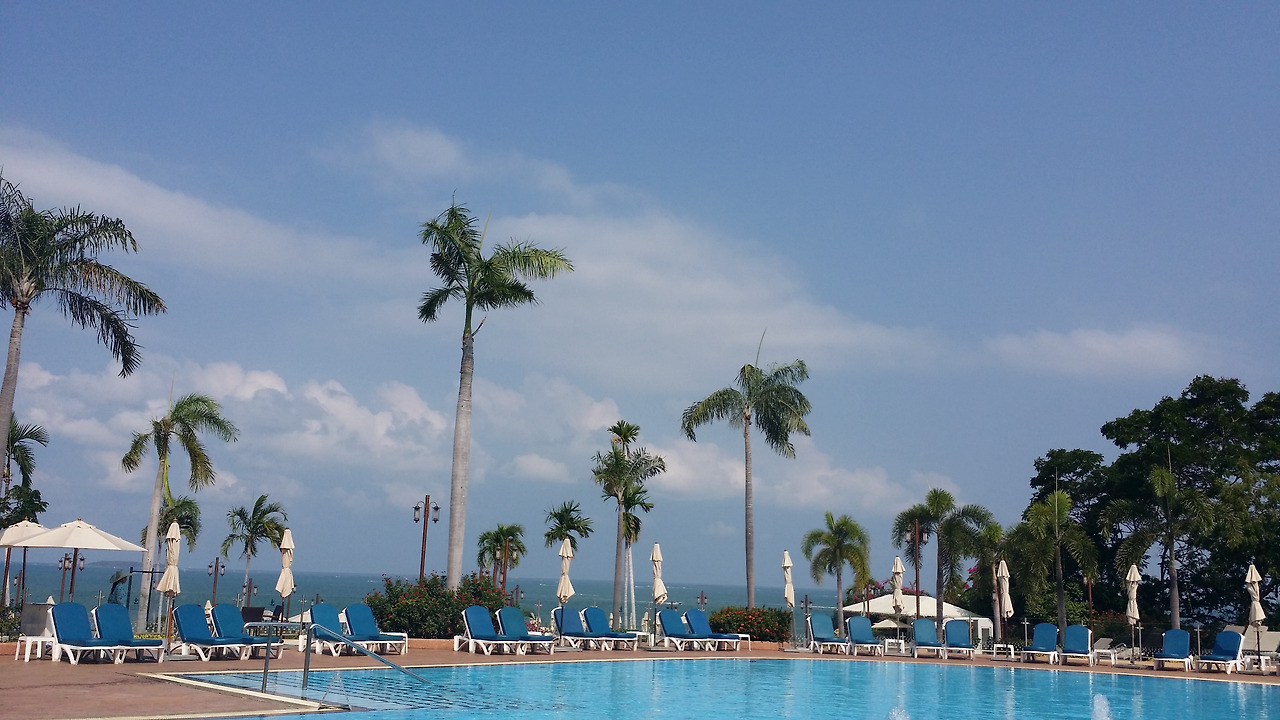 아침을 먹으면서도 눈과 마음은 바다가 내려다보이는 수영장을 향해 있다.