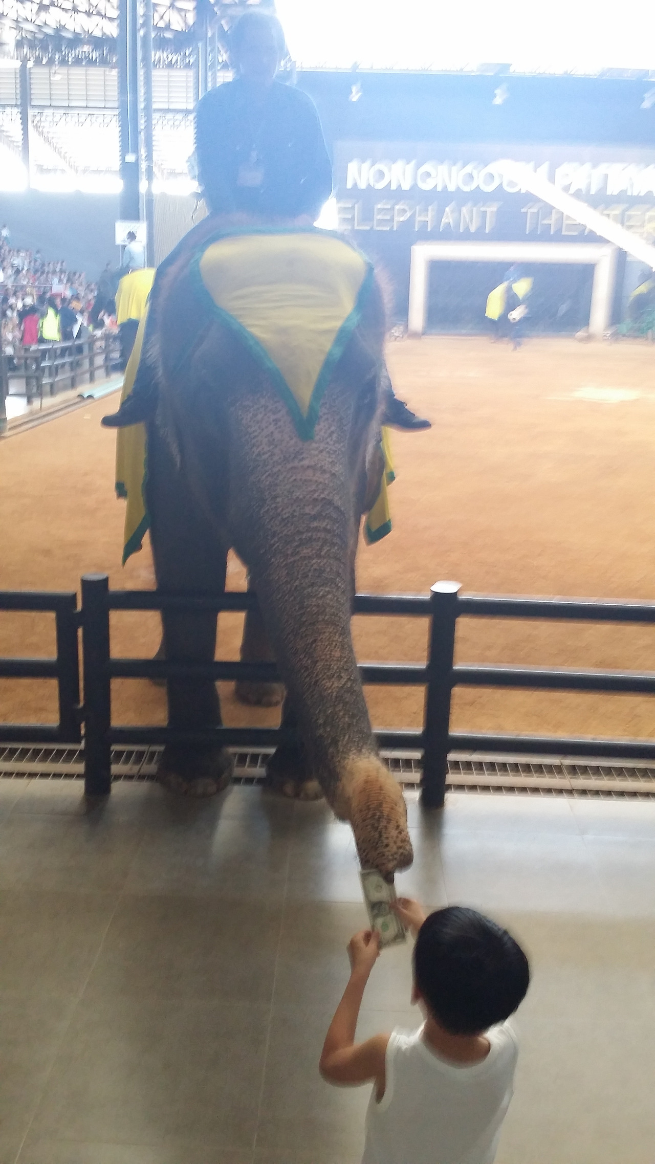 그런데 그러는 와중에도 양쪽 관객석을 향해 있는 코끼리는 조련사를 태우고 기다란 코를 쭉 내밀어 관람객에게 팁을 받고 관람객이 주는 바나나