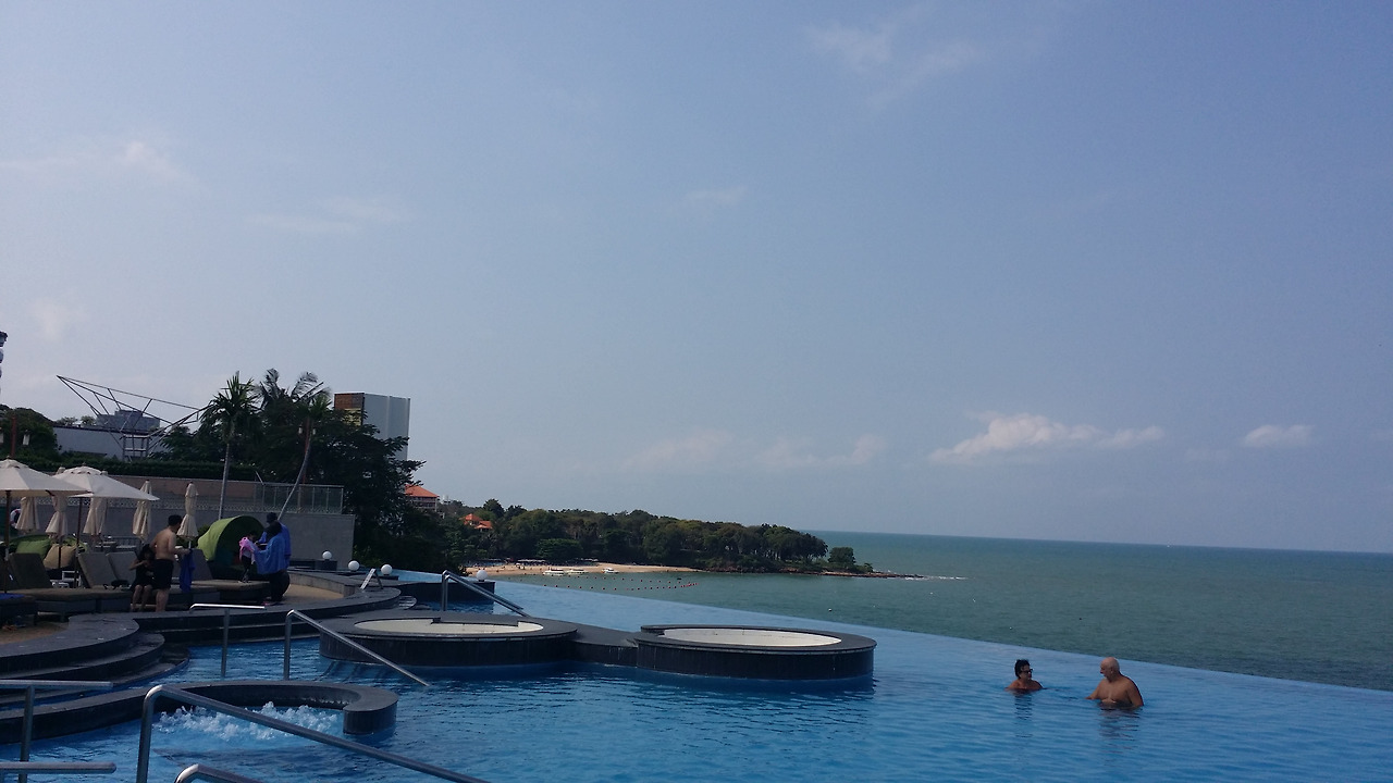 바다와 맞닿아 보이는 수영장. 저 멀리서 봤을 땐 수영장과 바다의 수면 높이가 같아 보여 깜짝 놀랐다가, 좀 가까이 갔을 땐 바다 밑으로 뚝 떨어지는 거 아닌가 싶게 느껴졌다가, 수영장 끝 쪽에 이르러 아래를 내려다 보니 '아, 그러면 그렇지. 이렇게 돼 있던 거구나' 한다.