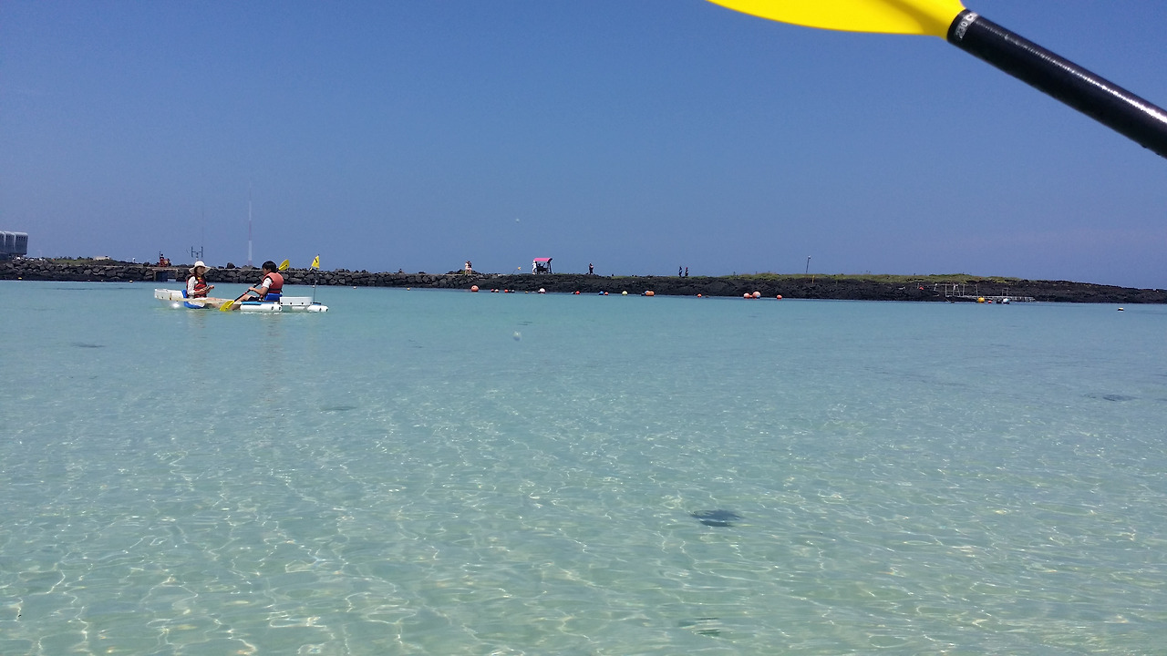 유유히 노를 저어 투명 카약 타는 곳으로부터 멀어졌다. 노를 젓고 싶어하는 아들에게 잠시 노를 쥐어주고 얕고 투명한 월정리 바다를 사진에 담아본다.