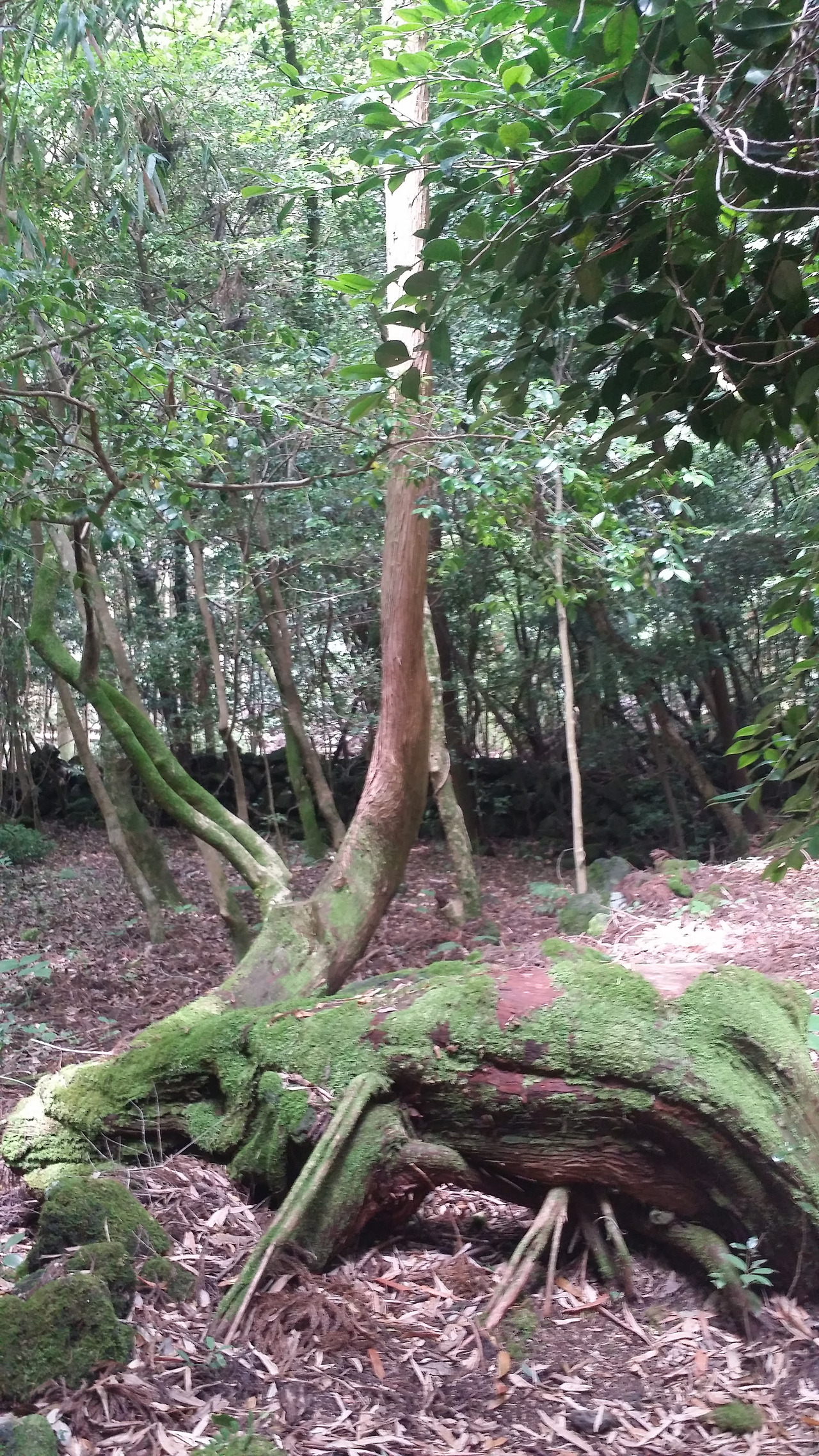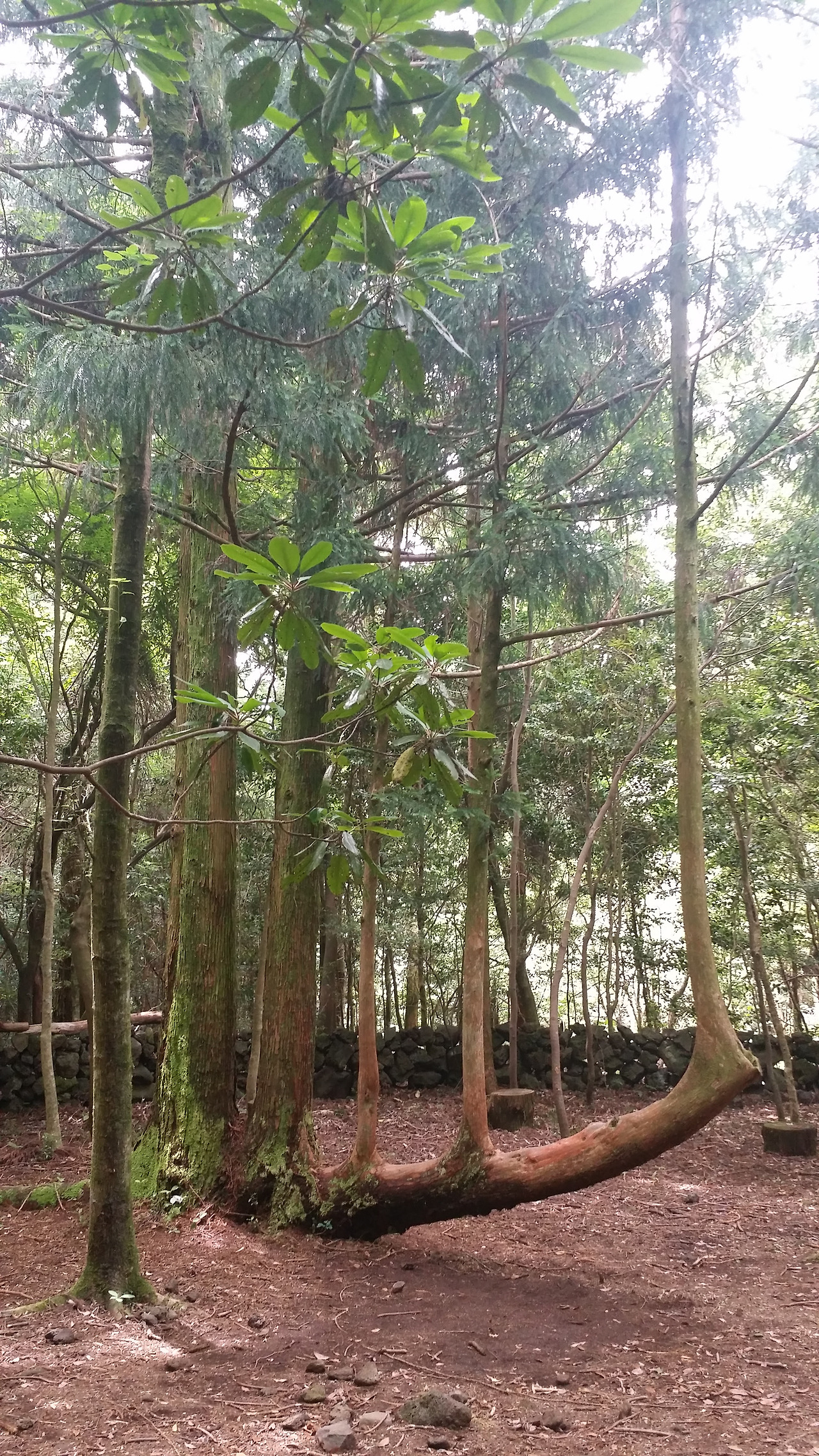 숲에서 만난 특이한 나무들. 옆으로 쓰러진 나무가 생존을 위해 다시 위로 처절하게 자라면서 가지가 7개로 뻗어나가기도 하고(왼쪽) 햇빛을 받고 살아남기 위해 위로 갈라지며 가지를 뻗는다.(오른쪽)