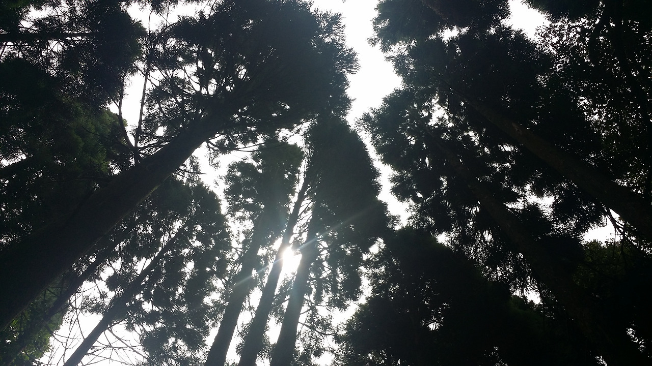 서로 해치지 않는 범위 내에서 가지를 뻗고 함께 자라는 나무들 사이로 햇살이 비친다.