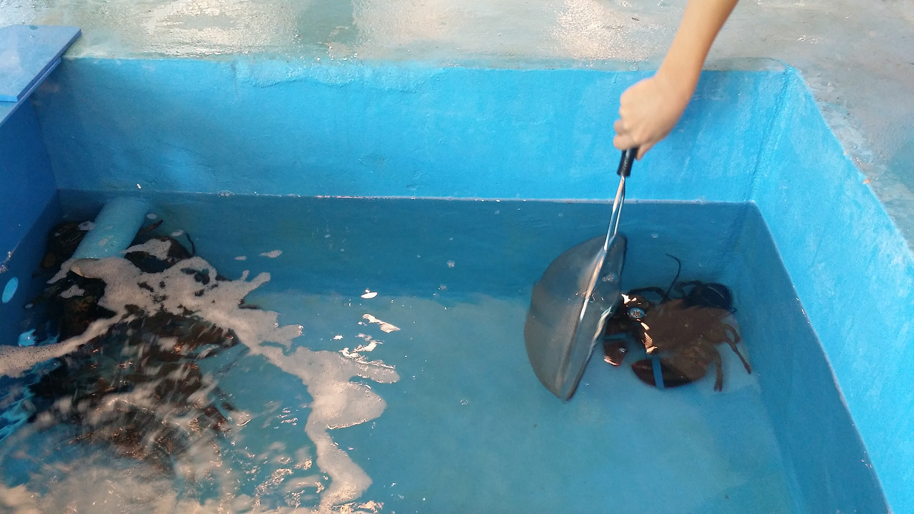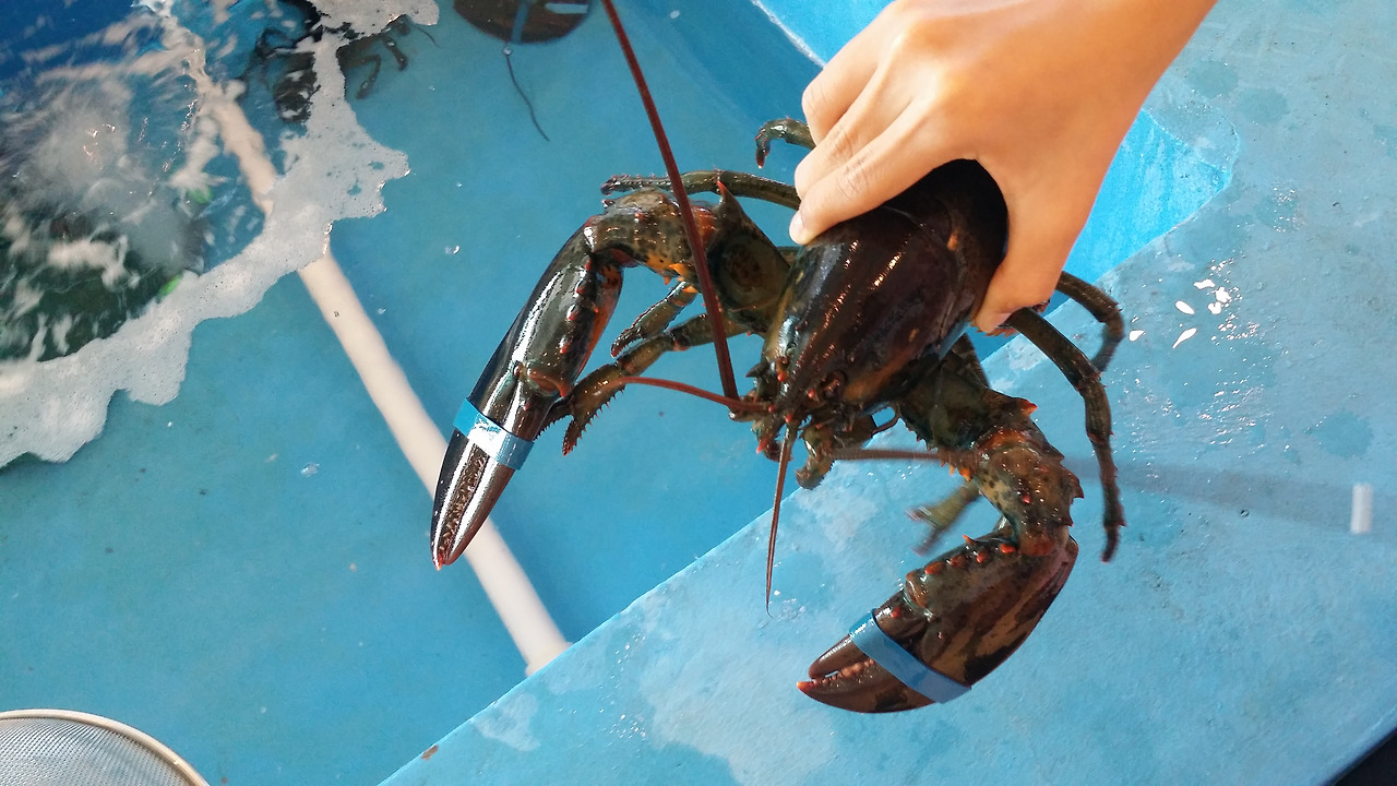 안으로 들어서자마자 아이의 눈길을 끈 건 당연히 물 속에 옹기종기 모여있는 랍스타다. TV프로그램 '슈퍼맨이 돌아왔다'에서 고지용의 귀여운 아들이 직접 랍스타를 건져올린 걸 봤는지라 아이도 뜰채를 이용해 랍스타 한 마리를 건져올려 만져봤다.