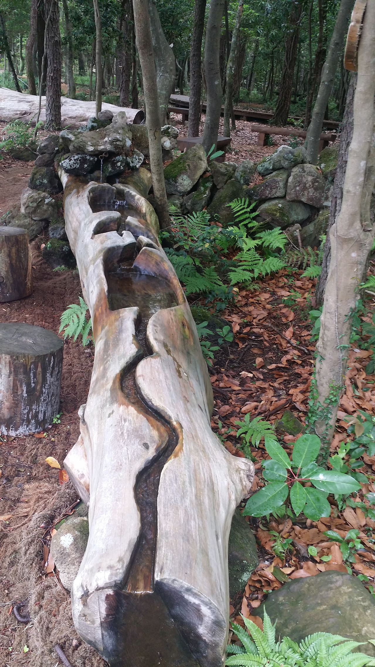 치유의 숲 매표소(어른 천 원, 청소년 600원, 아이는 무료)와 통나무를 뉘어만든 시원한 치유샘.