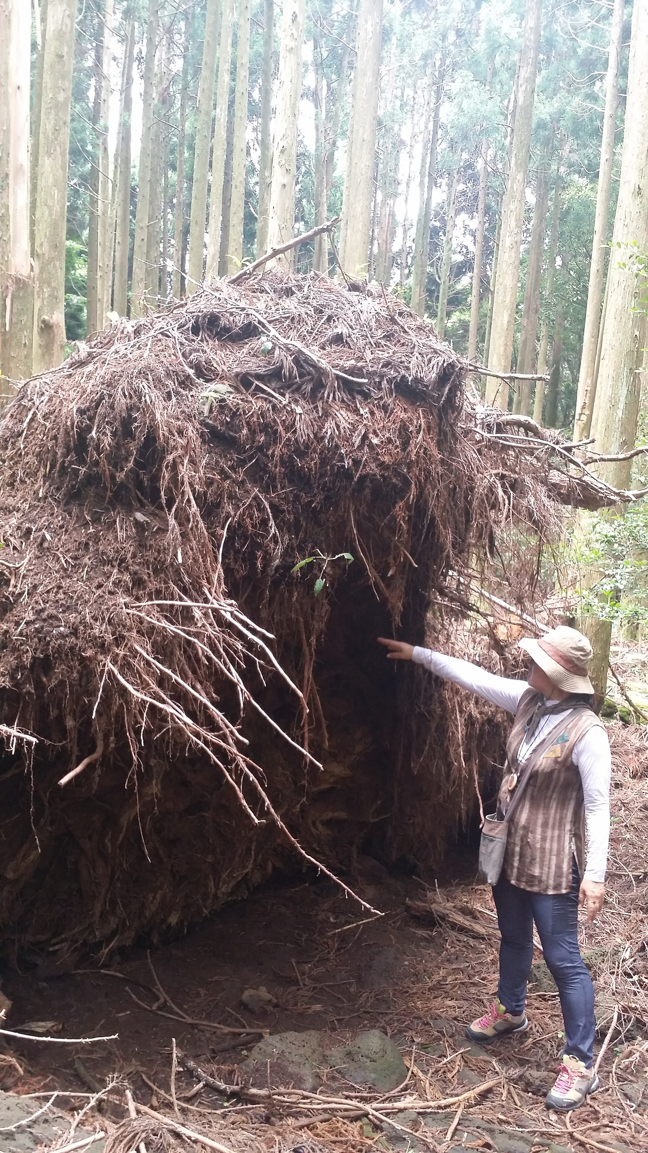 맨 왼쪽은 지난 태풍으로 인해 땅에 깊이 뿌리내리지 못한 나무들이 한꺼번에 쓰러진 나무들이라고 한다. 가운데 사진은 두 나무가 손을 꼭 잡고 있는 부부 삼나무, 오른쪽 사진은 편백나무 치유 공간이다.