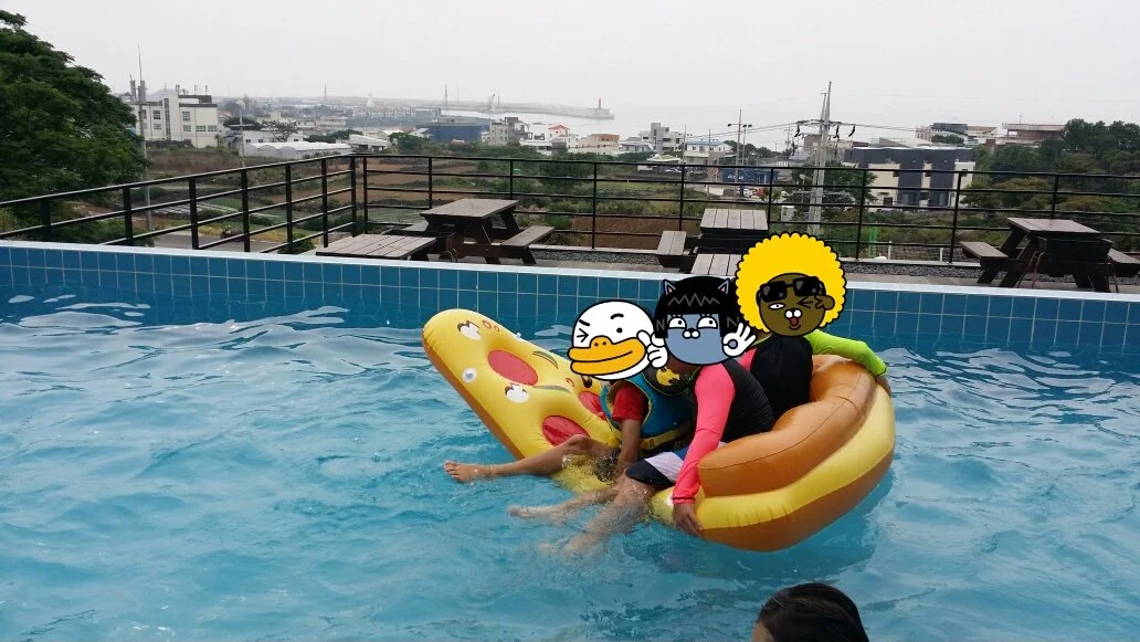 바람 넣는 건 빡셌지만, 셋째날 애월에 위치한 숙소(샐리스 호텔)의 야외 온수풀에서도 아이 셋이 신나게 타고 놀았으니 열심히 입으로 불어넣은 보람은 있었다.