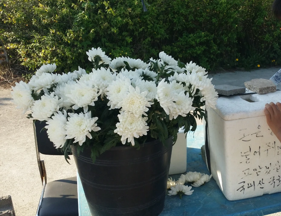 아이는 스티로폼 박스에 천원을 넣고 국화 한 송이를 고른다.