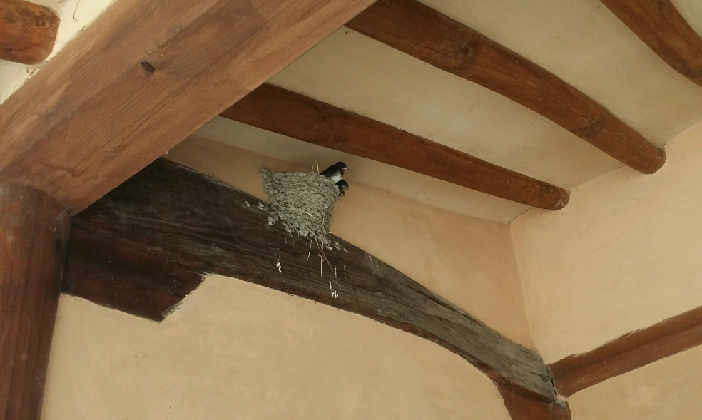 초가 지붕 아래 까치들이 둥지를 틀고