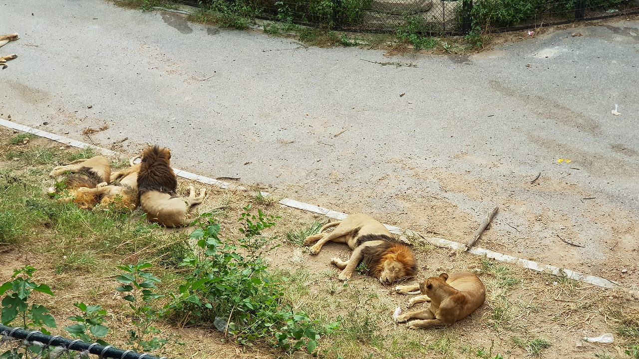 투명한 유리창 넘어 넓게 조성된 숲 곳곳에 사자와 호랑이들이 야성미 넘치는 맹수의 모습은 온데간데 없이