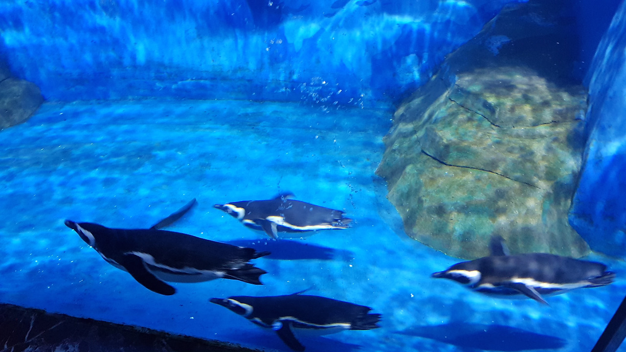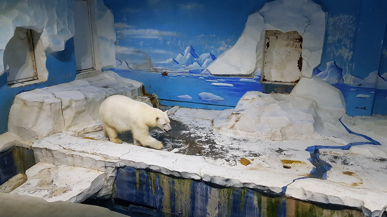 무리지어 헤엄치는 펭귄들과 대조적으로 혼자 좁은 수족관을 왔다갔다 배회하던 북극곰 한 마리.