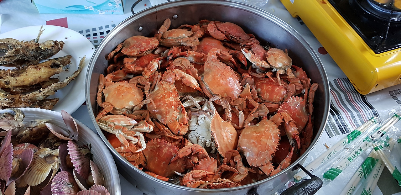 점심은 바닷가 식당에서 전어구이와 작은 꽃게찜, 조개찜.